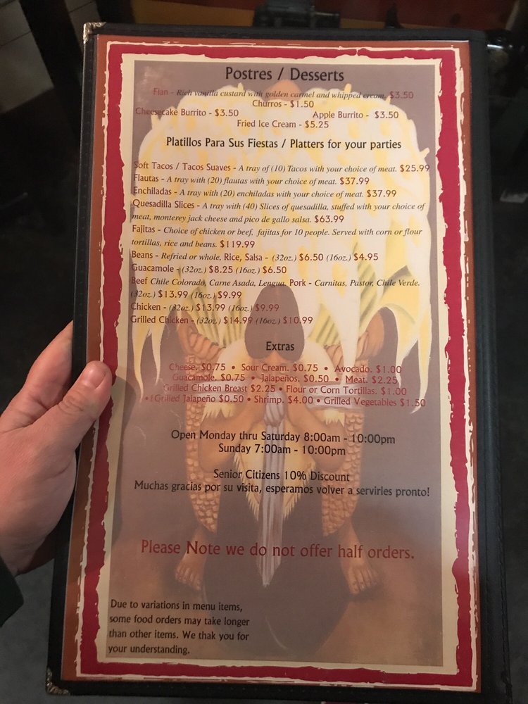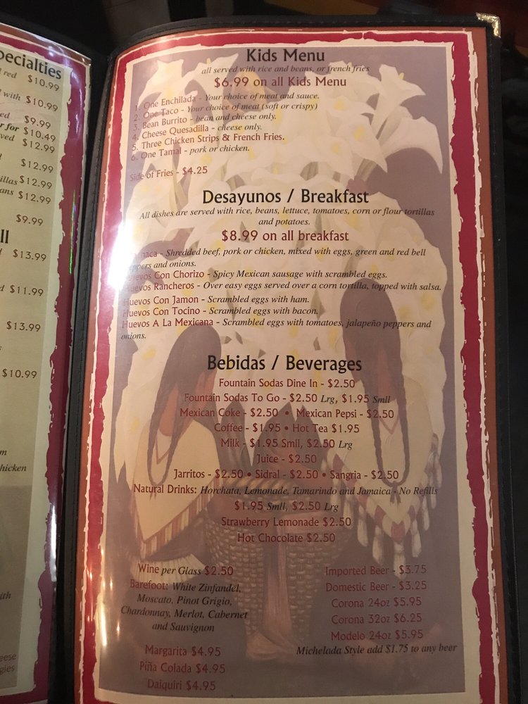 Choice of machaca, chorizo, tocino, jamon, huevos a la mexicana and potatoes, with rice, onion, cilantro, Monterey jack cheese, sour cream, guacamole, pico de gallo salsa and whole beans.