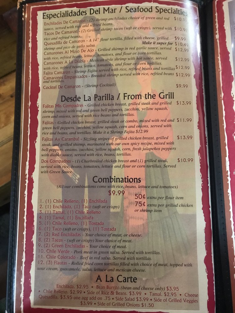 Shrimp, mixed with red and green bell peppers, zucchini, yellow squash, corn onions, rice and refried beans, with flour, wheat or corn tortillas.